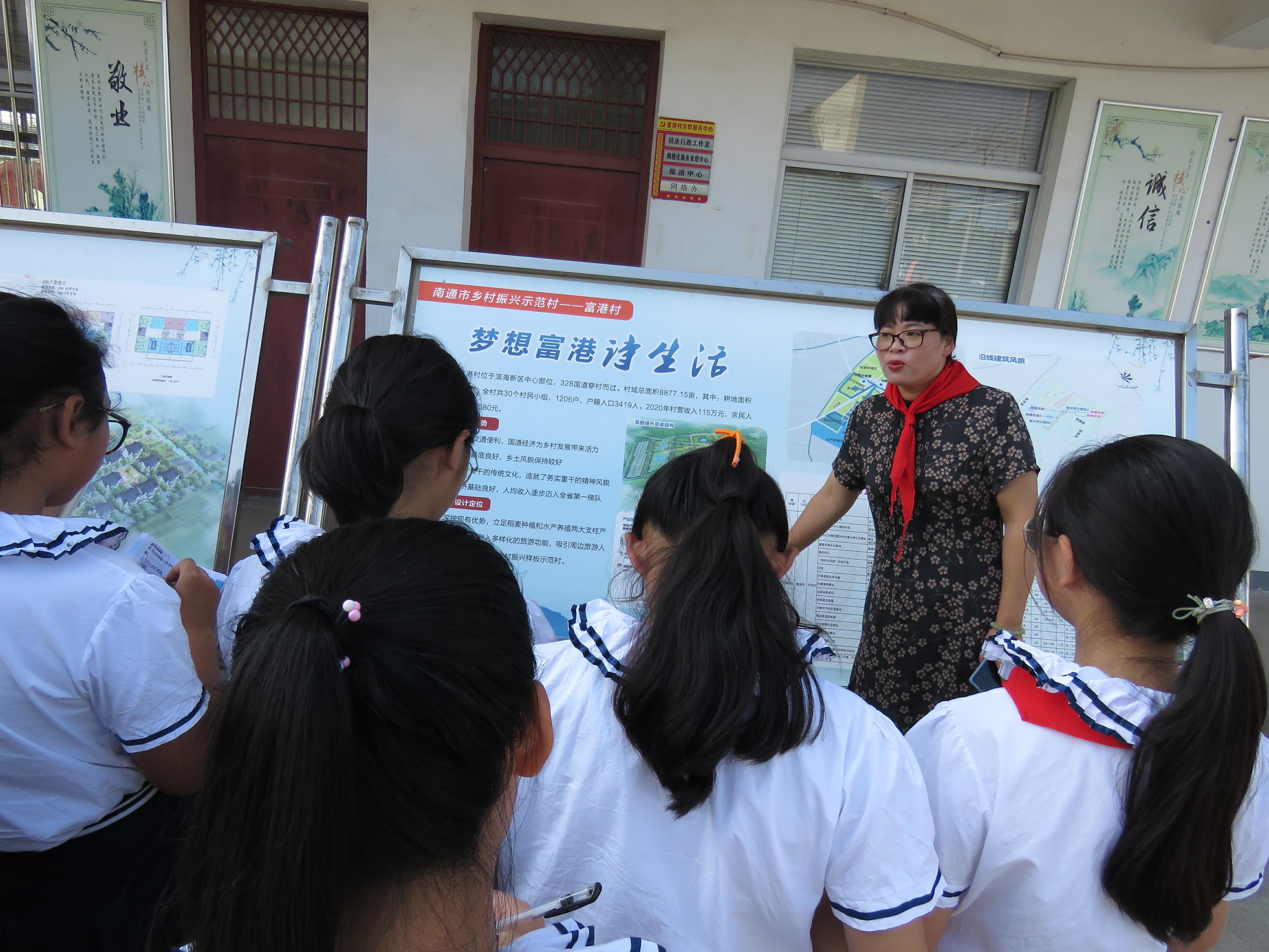 随后,队员们在王书记的带领下,参观了富港村内的展板。王书记详细耐心地向队员讲解着富港村从一个“穷”村变成现在海安市示范村的经过。书记讲得很是细致,队员们听得格外认真。