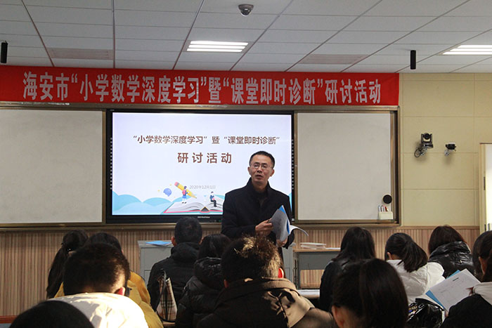 为了探索小学数学课堂学生状态即时诊断的时机,构建“学为中心”的课堂,引发学生的深度学习。2020年12月1日上午,海安市“小学数学深度学习”暨“课堂即时诊断”主题研讨活动在老坝港小学举行。出席本次研讨活动的有海安市教师发展中心数学研训员仲海峰校长、高新区和李堡镇数学骨干教师代表、角斜镇全体数学教师共六十多人。