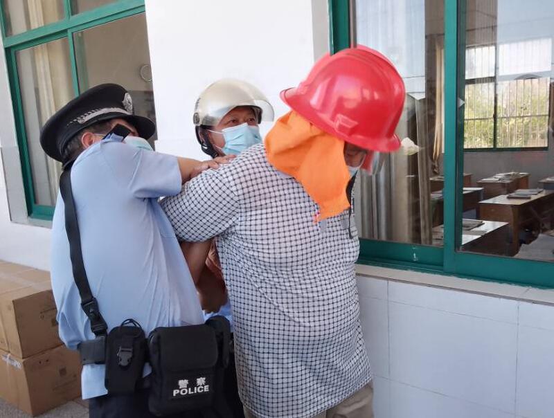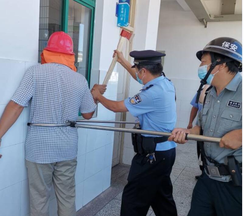 “歹徒”发现全校师生已经在接到警报后,第一时间躲进教室,关锁好了门窗。他无从下手,在六(1)班教室后窗观察后,试图从六(1)班教室前门破门而入行凶,被追赶过来的民警和保安在六(1)教室门外控制,随后将其扭送到学校对门的派出所。